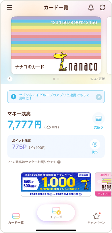 nanacoアプリへのカード登録が完了しました。これでnanacoポイントの交換をnanacoアプリからご利用いただけます。